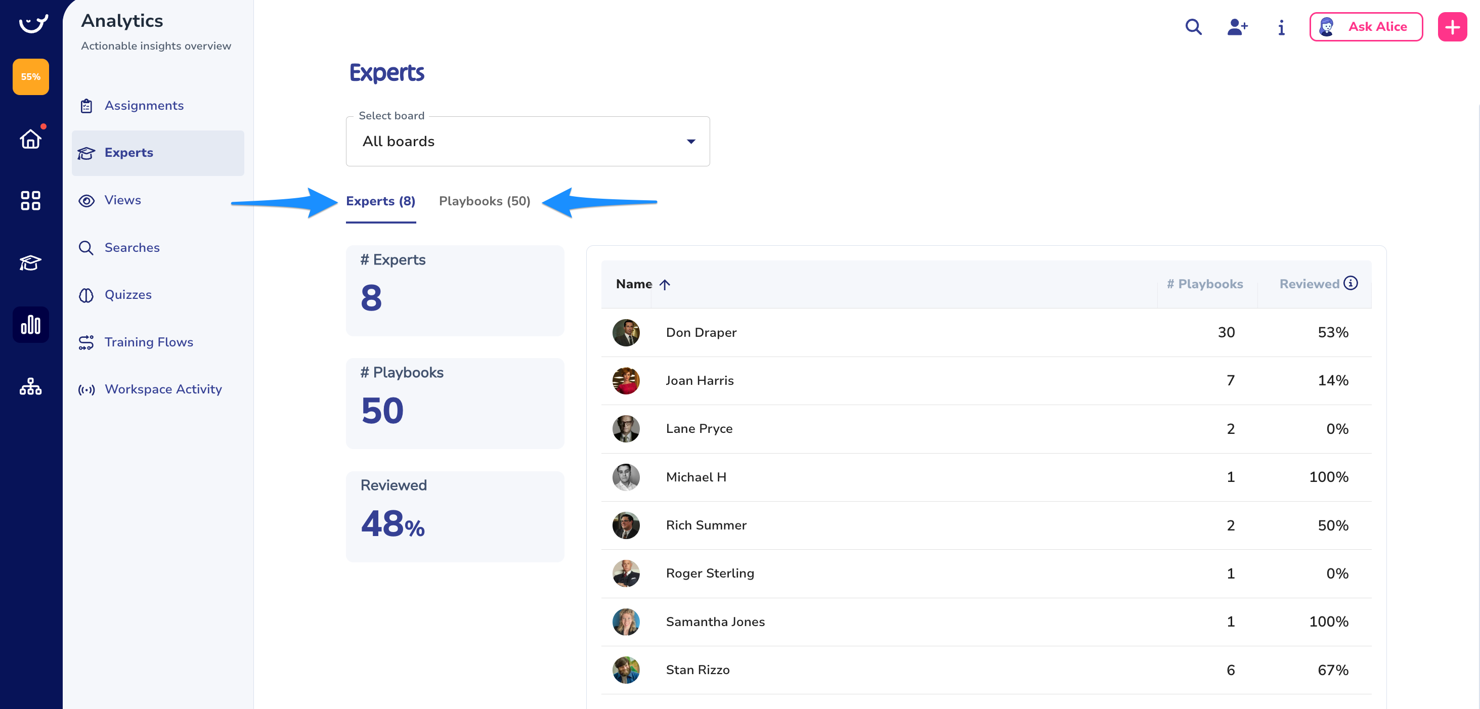 The Experts tab gives you an overview of the review cycles that are set to different experts. You can find the amount of playbooks assigned as well as the progress of the reviewed ones.