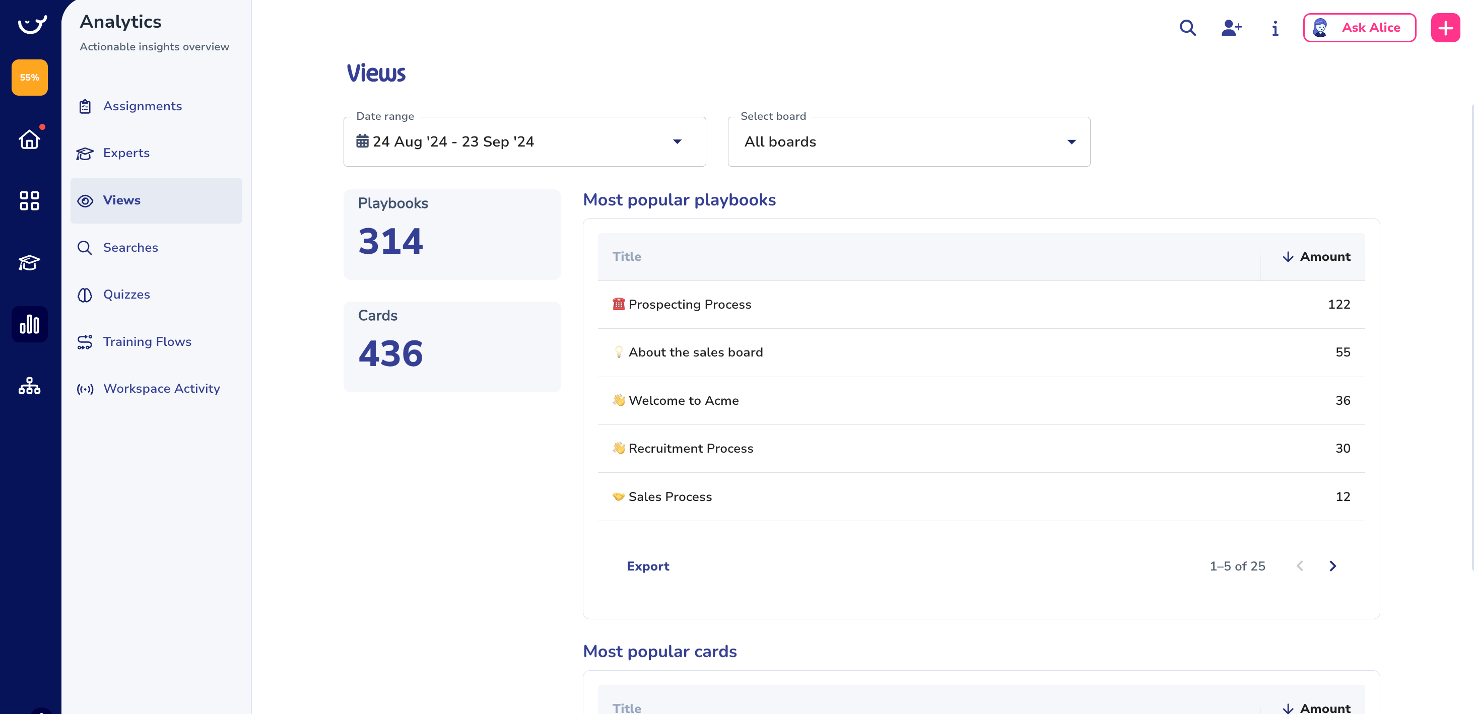 This section will tell you everything about the card and playbook assignments and insights on the progress and the completed assignments per user.