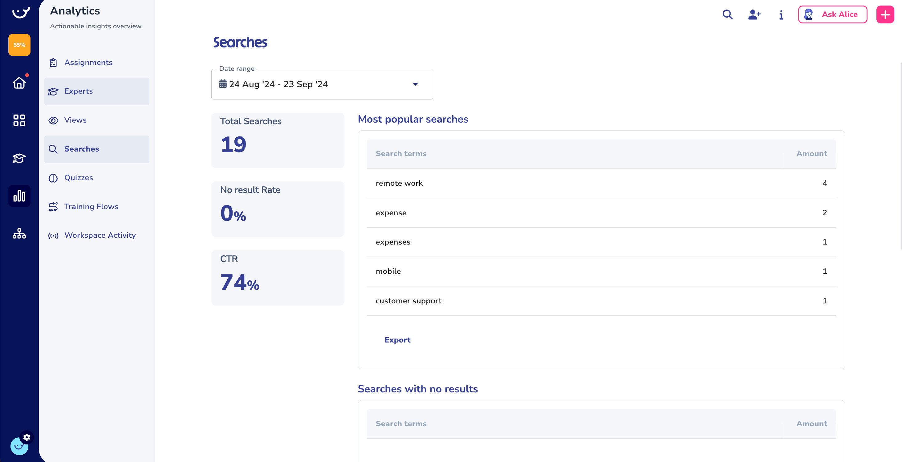 Knowing what your colleagues are searching for within Whale is very powerful. Especially because here you can find a distinction between "Most popular searches", "Searches with no results" and "Searches with no clicks".