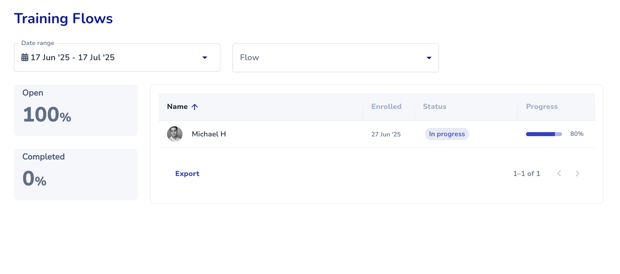 Automating the assignment of you content is one thing and with the Analytics of the training flows you can easily follow up who's where in your flow. Check your team members' progress by selecting a specific flow, time frame and then click on the user.
